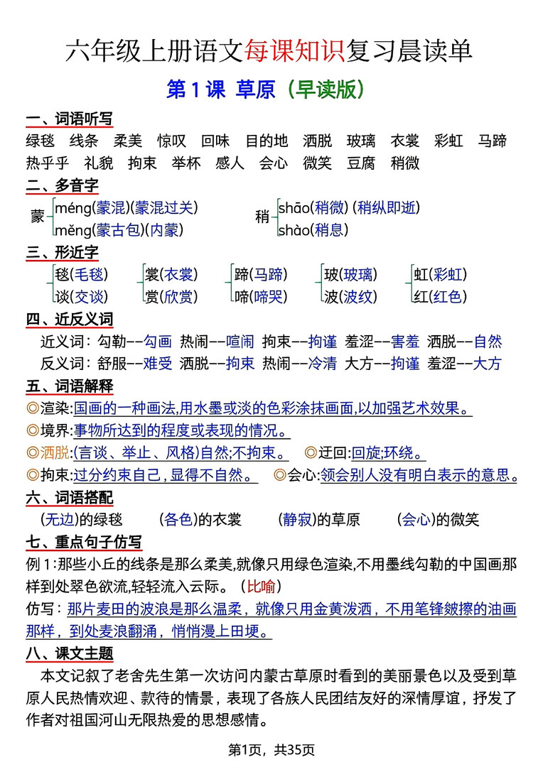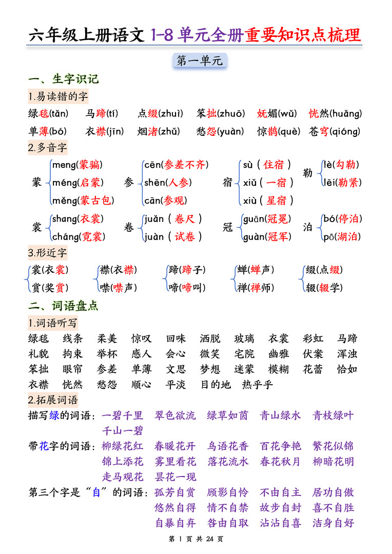 1212 六年级上册语文每课知识复习晨读单