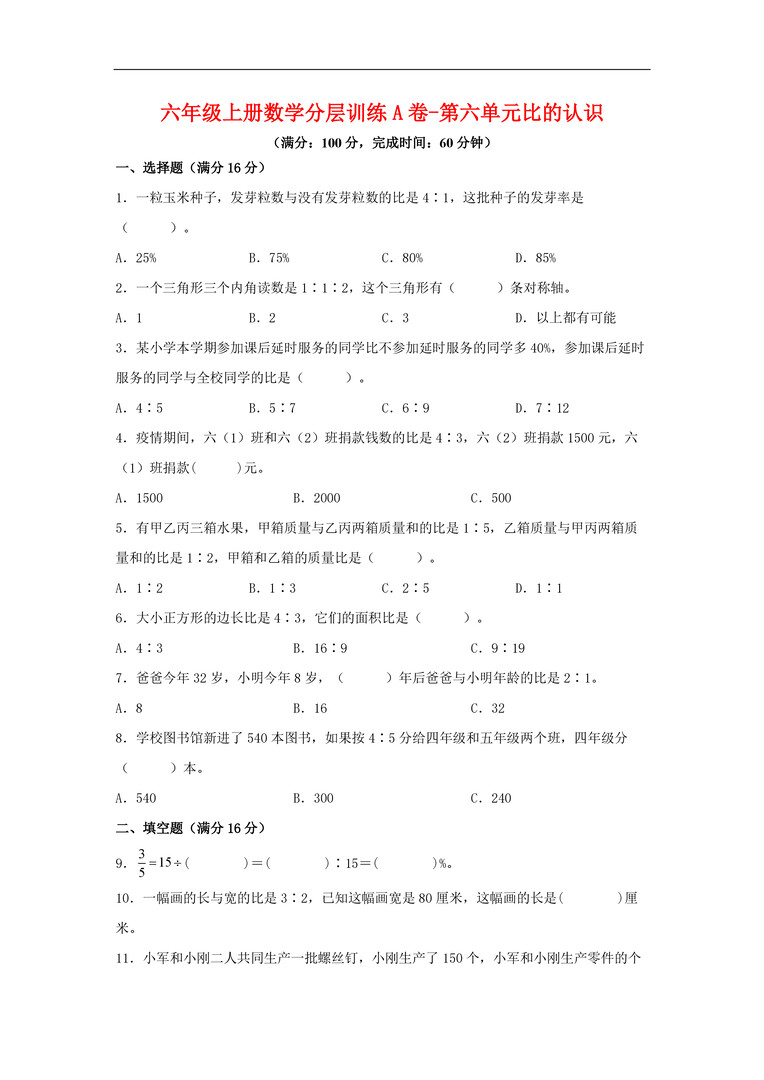 六年级上册数学北师大版分层训练A卷-第六单元+比的认识(单元测试)