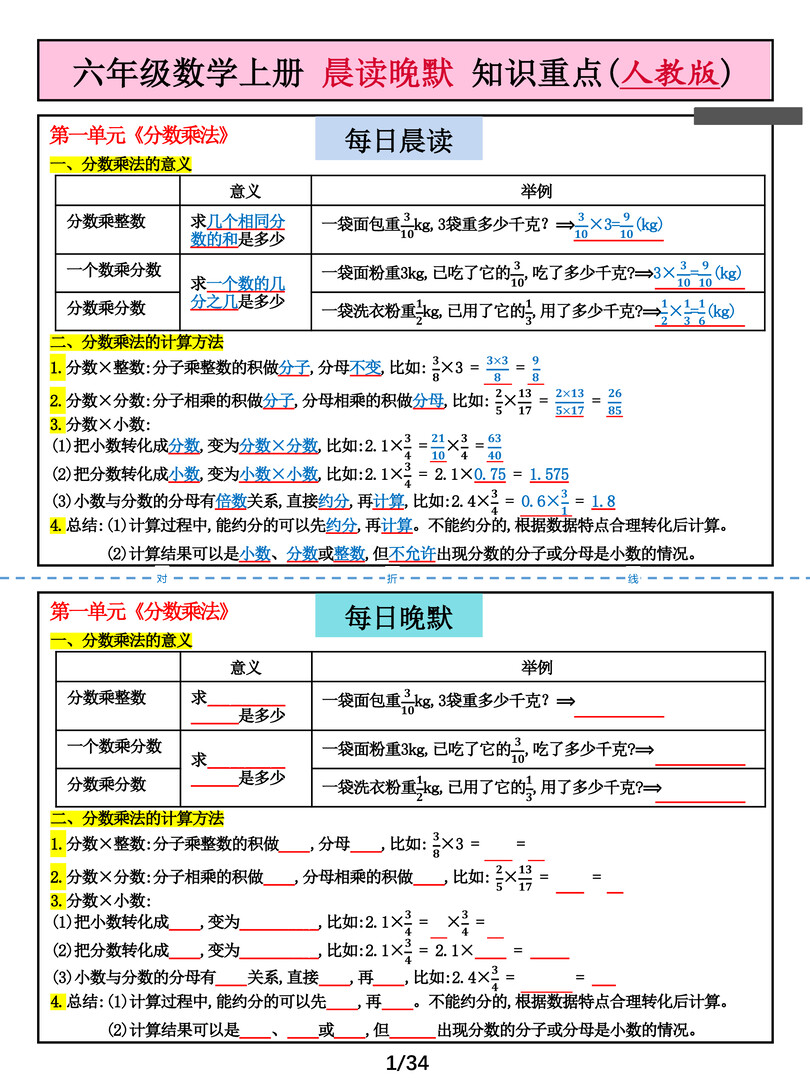 六年级上册数学晨读晚默综合每日一练