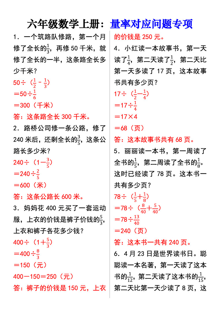 六年级上册数学量率对应问题专项