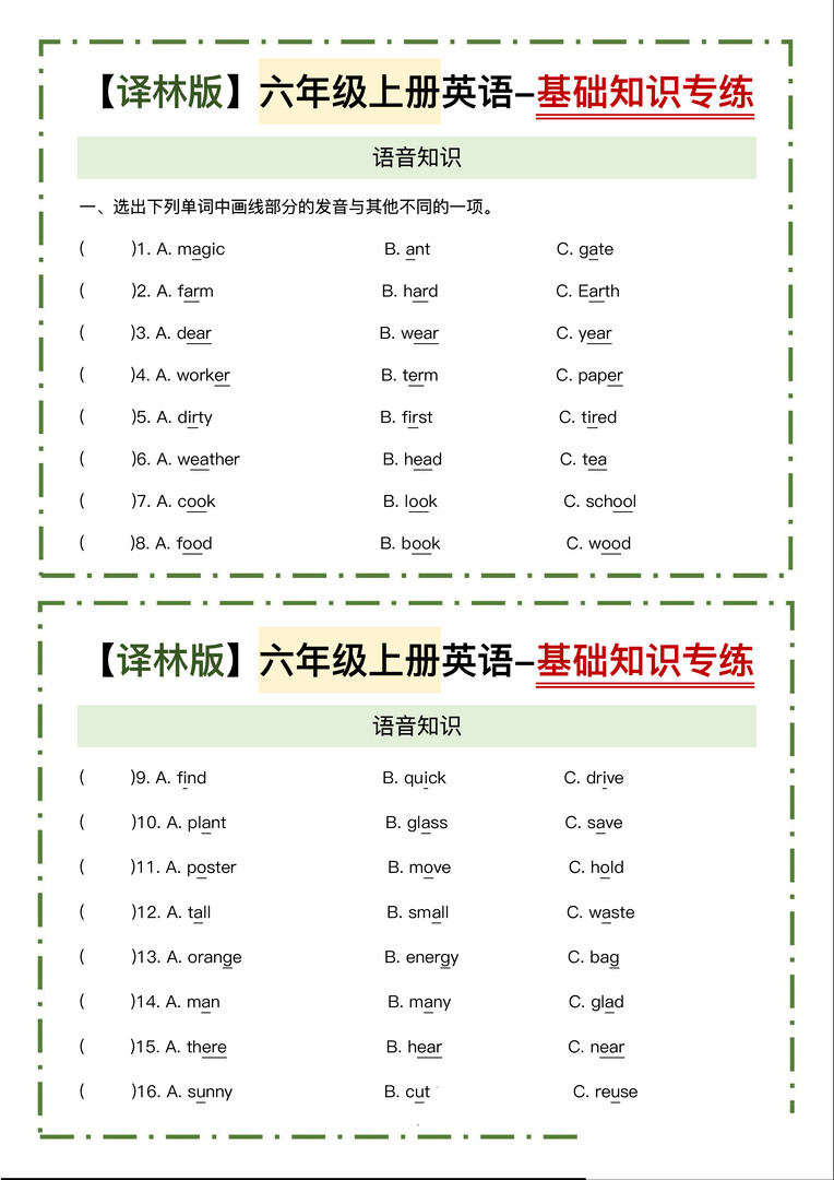 六年级上册英语译林版基础知识专练小纸条