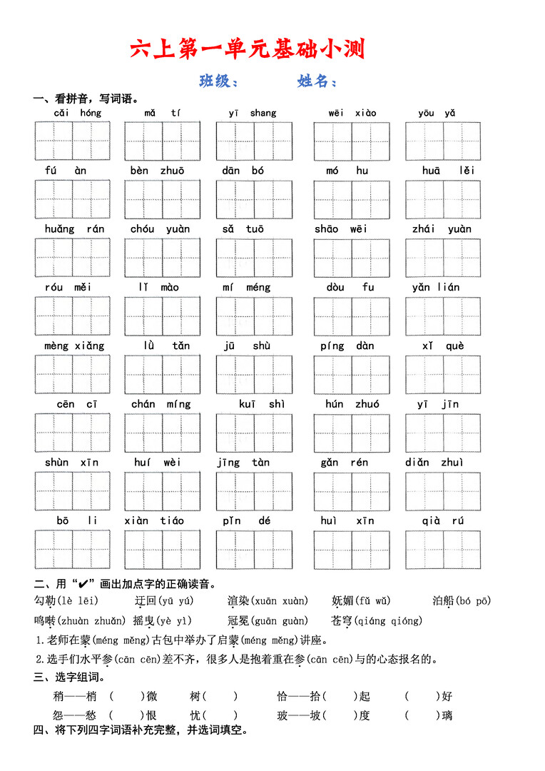 六年级上册语文1-8单元基础小测(空白)