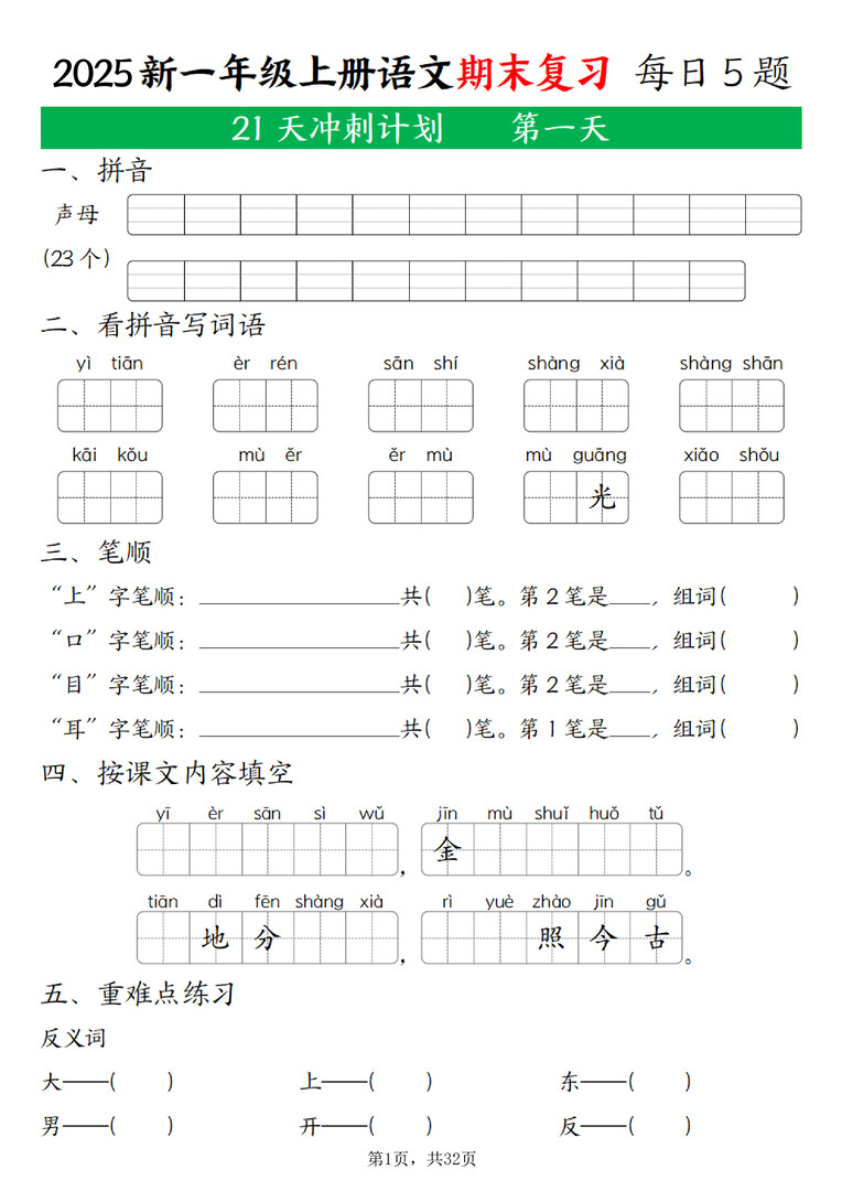 【25年一上语文期末复习21天冲刺计划(每日5道题)含答案32页