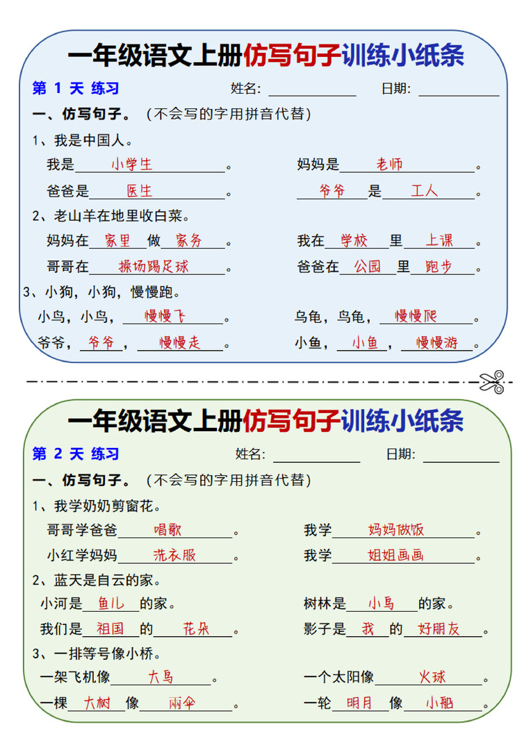 新一上语文仿写句子训练小纸条(含答案10页)(